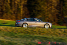 Plus sérieusement, la large et haute calandre confère à notre vaisseau amiral un ton très solennel, presque massif. Pour les côtés et l’arrière, les designers ont été un peu plus légers et je trouve ces parties un peu plus discrètes. Les jantes en aluminium coulé de 20 pouces et 20 branches donnent un côté rutilant à cette limousine et avec une couleur plus foncée, j’aurais presque cherché les porte-drapeaux pour fixer les armoiries de ma famille afin de parader dans mon quartier.