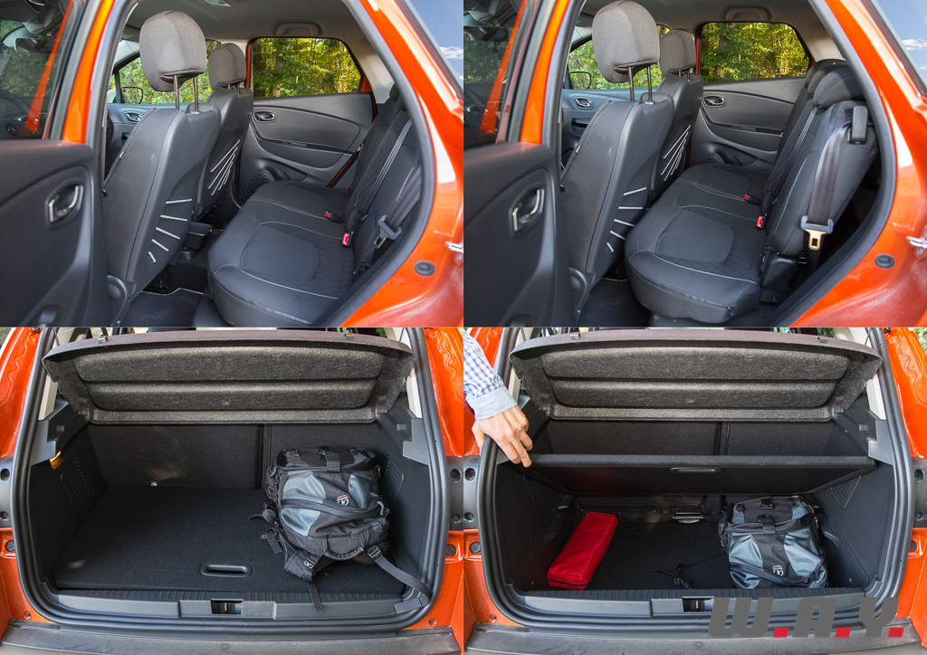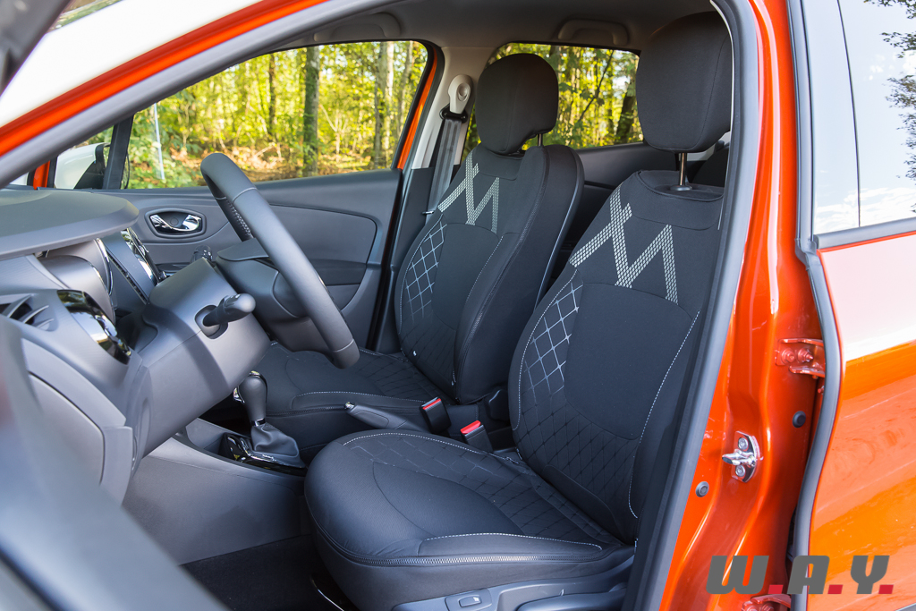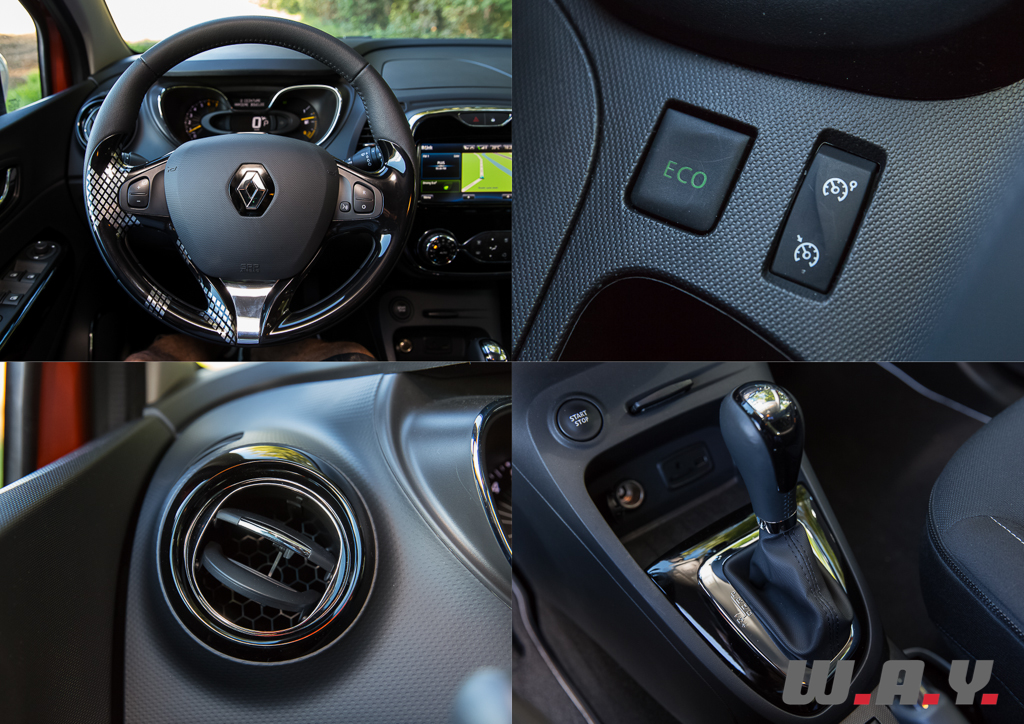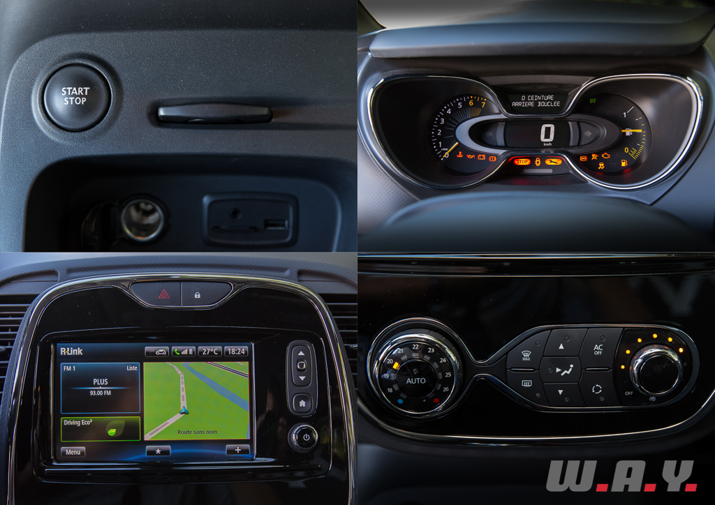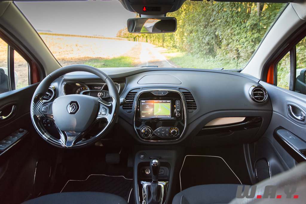 L’aménagement intérieur du Captur est très largement emprunté à la Clio IV. Selon la finition choisie, la planche de bord reçoit des inserts de plastique colorés ou chromés. Sur la console centrale prend place un écran tactile de 7 pouces qui permet de gérer le R-Link, un ingénieux système multimédia intégrant ordinateur de bord, téléphonie embarquée, navigation TomTom et la possibilité de télécharger de petites applications très ludiques.