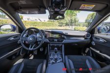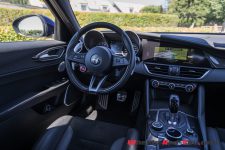 A l’intérieur comme à l’extérieur je retrouve, à quelques détails près, l’intérieur des autres versions des gammes Giulia et Stelvio. La très réussie planche de bord à double casquette de compteurs, le volant multifonction, l’écran central parfaitement intégré à la console et les commandes situées sur le tunnel de boîte, tout est identique.