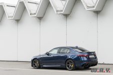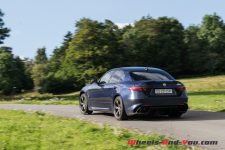 Corollaire physique de ce train avant incroyable, le train arrière est mis à rude épreuve. Si, sur le sec, son efficacité est elle aussi redoutable, et cela malgré les 510 ch à transmettre sur ses seules deux roues motrices, lorsque l’adhérence diminue, l’électronique est là pour veiller au grain. Les vitesses alors atteintes sont étonnantes pour une berline. Derrière le volant, la sensation d’efficacité et de vivacité est grisante, l’électronique laissant une bonne latitude pour faire glisser l’auto à la demande.