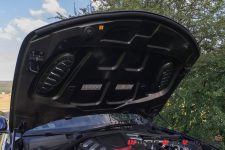 Le bouclier avant, toujours coupé en deux par l’historique calandre triangulaire, adopte une lame carbone du meilleur effet et de grosses prises d’air latérales, alors que le capot tout en carbone et les ailes reçoivent des grilles d’aération. Les bas de caisses, du même matériau composite, sont profilés pour une meilleure aérodynamique et viennent mourir sur des ailes arrière élargies. La male reçoit un petit béquet carbone plutôt discret alors que la jupe arrière est remplacée par un énorme extracteur.