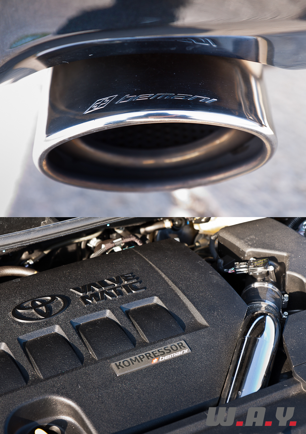 L’intérêt de cette Auris Kompressor se trouve donc sous le capot. Prenant comme base la version “S” 1.8 litres Valvematic de 147 CV, le préparateur de Beinwil Am See (AG) y ajoute donc un compresseur et toute la plomberie en conséquence. Les mécaniques Toyota n’ont plus de secret pour lui; au fil des années, Bemani est devenu l’une des références parmi les préparateurs suisses, en particulier pour les Lotus à moteur Toyota. Son catalogue propose en outre le même montage pour bon nombre d’autres propulseurs de la marque japonaise. Donc notre sympathique compacte voit sa puissance augmentée de 63% (ou 93 CV), culminant ainsi à 240 CV. Le couple subit le même traitement, passant de 180 à 278 Nm (+ 54%). Ca promet ! L’échappement se voit modifié, plus libre, et doté de deux grosses sorties latérales en inox distillant un son très rauque en parfaite adéquation avec la définition de l’auto. Le châssis quant à lui est également revu compte tenu de la nouvelle puissance, rabaissé de 40 mm et équipé de suspensions raffermies H&R. Tout un programme !