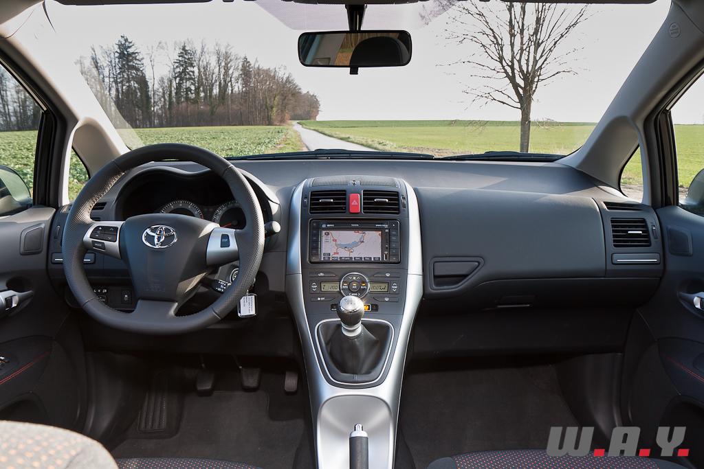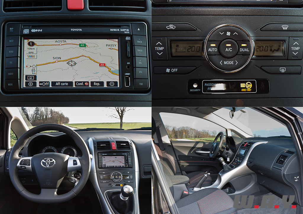 L’habitabilité est sans nul doute l’un des points forts de cette Auris. Beaucoup d’espace, un habitacle baigné par la lumière et nombre de rangements seront à votre disposition. La visibilité est excellente, quoique entravée aux 3/4 avant par des montants de pare-brise imposants. Les passagers arrière trouveront suffisamment de place pour leurs jambes, même avec les sièges avant reculés à leur maximum. Appréciable pour les grands gabarits. Toutefois, le manque de maintiens prononcés sur les places arrière péjore considérablement le confort sur les tracés sinueux. A l’avant, l’assise particulièrement haute des sièges oblige l’adoption d’une position de conduite particulière, peu propice à une conduite sportive que laisserait supposer le pédigrée mécanique de notre auto. La faute probablement à la console centrale surélevée, sur laquelle trône fièrement le levier de vitesses, qui ne permettrait que très difficilement un positionnement plus bas. Comme à l’arrière, l’assise des fauteuils avant manque singulièrement de profil. Dommage, car le dossier, quant à lui, remplit parfaitement ce rôle. La capacité du coffre est dans la norme pour la catégorie, 354 litres, pouvant atteindre 1’335 litres une fois la banquette rabattue (60/40).