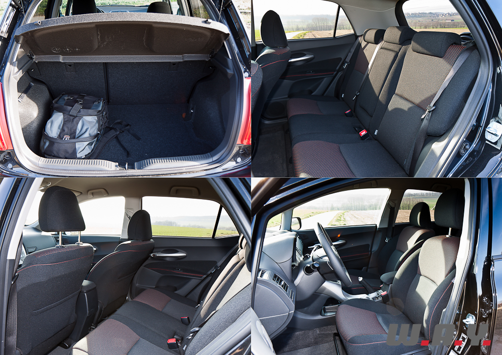 Dans l’habitacle, le conservatisme, voire la tristesse, prévalent. Seules les surpiqûres et tissages rouge de la sellerie ainsi que les quelques touches gris aluminium apportent un soupçon de gaieté. Malgré ce constat, je reste agréablement surpris par la bonne qualité de fabrication de l’intérieur. Certes les matériaux sont basiques (plastique et tissu), mais le choix des textures ne souffre d’absolument aucune critique compte tenu du positionnement tarifaire de l’auto. Le plastique moussé du haut de la planche de bord est agréable à la fois au toucher et à la vue. Excepté quelques défauts d’ajustement dans l’assemblage, les écrans digitaux d’un autre âge et l’aspect bon marché de certains boutons, l’ensemble respire la qualité et est bien loin des moulages grossiers dont Toyota, et les constructeurs japonais en règle générale, étaient coutumiers il n’y a pas si longtemps. Du côté de la dotation, cette série limitée « Black & White » vous fera bénéficier d’un équipement enrichi, comprenant notamment le GPS à écran tactile, la connexion Bluetooth pour le téléphone ainsi que la climatisation automatique bi-zone. L’instrumentation est également sobre, mais les informations essentielles sont présentes et bien lisibles.