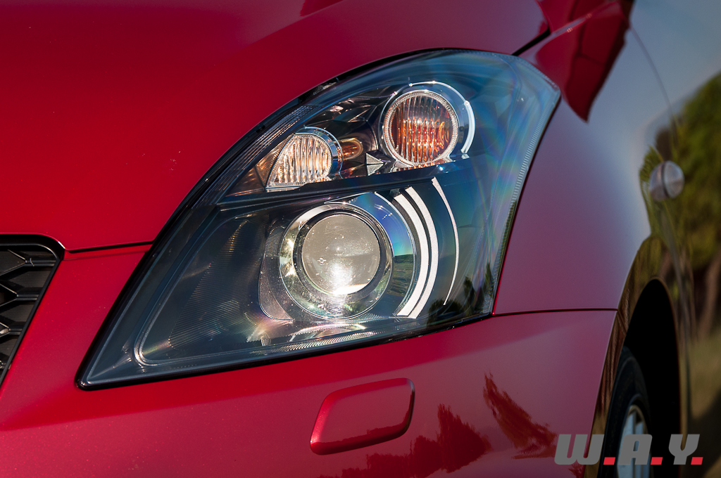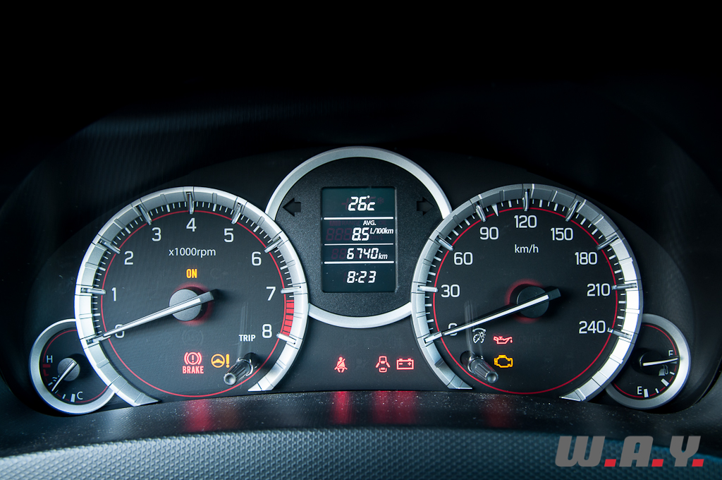 Lorsque l’on baisse le rythme, on retrouve une voiture qui est douce à conduire, restant précise mais pas très envoûtante. Il y a un « passage à vide » entre 2’500 et 4’000 tours puis si on continue d’appuyer (ce qui est rarement le cas en ville)  on s’envole jusqu’à la zone rouge (7’200 t/min). Alors on se laisse porter dans le flot de la circulation comme avec une voiture moins puissante. La nouvelle boîte qui offre désormais six vitesses reste très bien étagée et on peut facilement rouler en quatrième, voire en cinquième, à 2’000 tours. Mais si vous voulez vous extraire d’une situation, il vous faudra le plus souvent redescendre en deuxième. L’ensemble des commandes, clignotants, phares et essuie-glaces sont douces à manipuler. Pour le stationnement en ville, il y a une aide en marche arrière ce qui, même avec une petite voiture, rend le créneau plus facile. A noter que la vitre dite automatique côté conducteur, ne l’est qu’à la descente, ce qui est très agaçant. En effet, devoir rester appuyé sur un bouton pour que cette dernière remonte à son maximum oblige à quitter le volant trop longtemps car c’est toujours en roulant que l’on décide de remonter la fenêtre… La nuit venue, les compteurs restent bien lisibles et les bi-xénons éclairent la route suffisamment pour qu’on n’ait pas à se poser trop de questions.