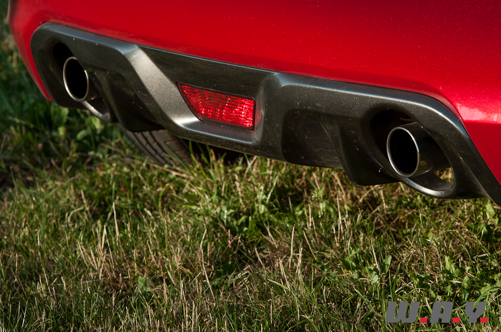 La face avant, avec sa calandre en nid d’abeille est massive mais reste agressive avec ses grands feux aux projecteurs bi-xénon de série qui lui donnent un regard d’aigle. Les voies élargies accueillent de belles jantes de 17 pouces. On a l’impression que les quatre roues ont été repoussées aux quatre coins de la voiture lui donnant un aspect trapu, ramassé avec la sensation qu’elle sera collée à la route. La poupe dispose toujours d’un grand béquet de toit un peu trop prononcé à mon goût, d’un magnifique diffuseur au look métallique encadré par deux grosses sorties d’échappement rondes en inox. Des bas de caisse renflés finissent de rendre définitivement sportive cette petite bombe mais comme souvent, ce qui est beau est peu protégé et que ce soit l’avant, l’arrière ou les côtés, cette voiture est vulnérable aux coups et vu son gabarit des villes, c’est regrettable.