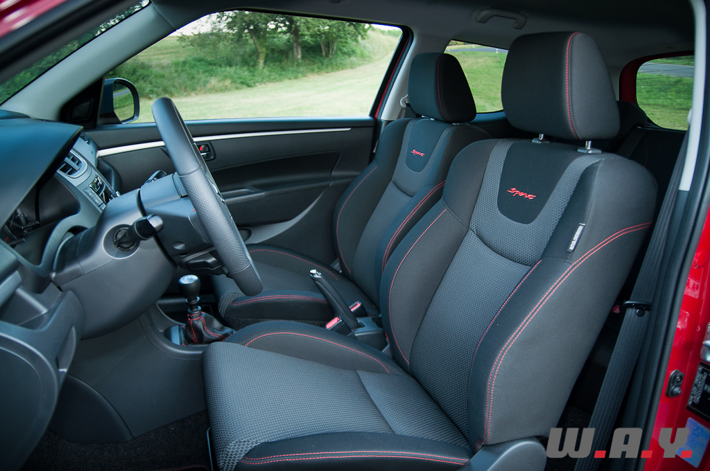 Chez Suzuki, la Swift Sport rime avec trois portes. Mais heureusement, il y a bien quatre places. Qui plus est relativement spacieuses – je parle de l’arrière – pour ce petit gabarit qui vient malgré tout de s’allonger de 12 cm en longueur pour atteindre 389 cm et 5 cm en largeur (169,5 cm) par rapport à son aînée.