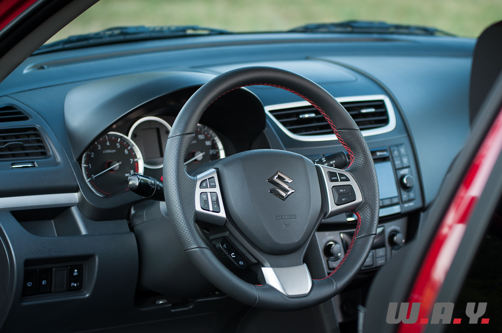 Elle est disponible en six couleurs allant du rouge de notre voiture d’essai (Ablaze Red), au noir en passant par un bleu, blanc et deux gris. Il n’y a pas vraiment de couleur fun style vert ou orange qui pourrait la sortir du lot, c’est un choix marketing. Pour ceux désireux de personnaliser leur Swift Sport, il existe toute une série d’accessoires (moulures, tapis de sol, jantes noires mat, etc.) ou encore trois kits « S Tuning ». Les kits « Basic » et « Plus » comprennent des bandes de couleur sur le capot, le toit et le hayon. Le « Pros » intègre en plus des jupes avant, arrière et latérales dans la couleur du véhicule, un kit de rabaissement avec des jantes spécifiques noir mat.