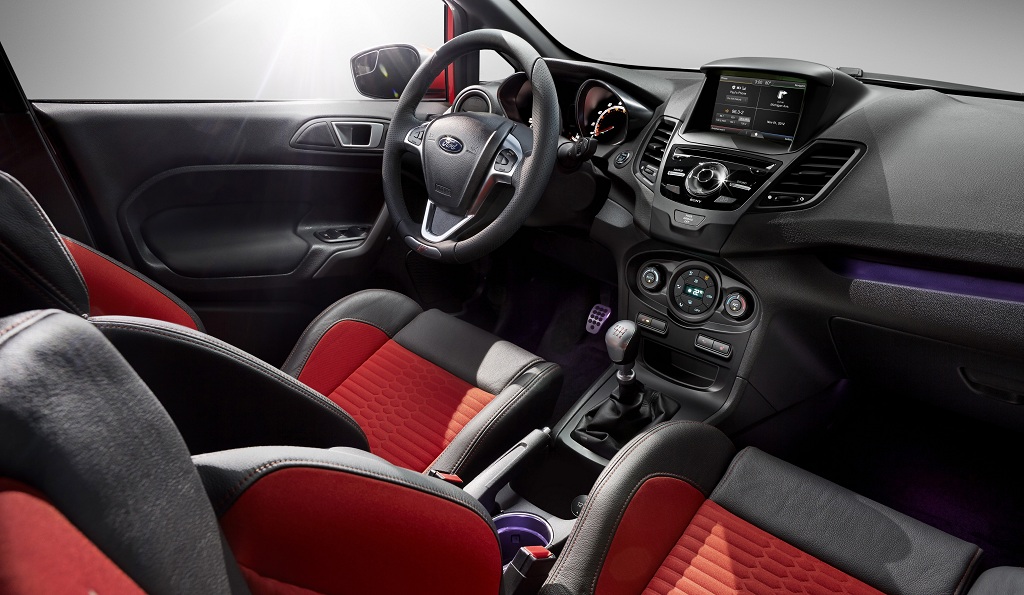 La Fiesta ST reprend la face avant de la nouvelle Fiesta mais avec une calandre en nid d’abeille. Elle sera aussi reconnaissable grâce son imposant diffuseur arrière ainsi que son habitacle résolument sportif avec des sièges Recaro de série.