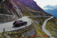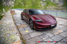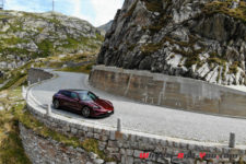 Au matin, 436 km à l’écran, je choisis la Tremola du Gothard. Le châssis PASM peut montrer le confort dont il est capable et je récupère tant d’énergie qu’à Airolo j’ai 431 km ! Bien qu’elle soit lourde, les nombreux chevaux électriques le masquent bien avec des accélérations franches et de bonnes reprises. Le centre de gravité placé très bas fige la voiture sur la route et l’aide à n’avoir pratiquement pas de sous-virage. Aidé des suspensions, la caisse ne prend pas de roulis. Je m’amuse au volant sur l’ensemble du col du Nufenen. Entrer en courbe se fait avec beaucoup d’élan, j’aime l’aspect direct et précis de la direction.