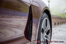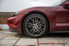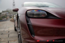 Un extracteur du même genre se trouve à la fin de l’aile et au début de la première porte, sculptant tout le flanc du même coup. Les jantes Taycan Turbo Aero jouent un certain rôle dans le style de l’auto mais aussi dans son aérodynamique. Une partie est pleine pour ne laisser apparaître que peu du système de frein peint en noir qui est derrière.