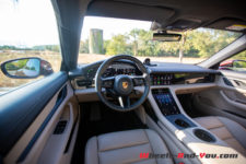 J’adopte immédiatement le volant. Sa forme ronde a une section tout juste comme il faut, avec quelques boutons utiles et des parties ajourées pour un visuel léger. Les sièges 14 réglages en cuir beige craie sont élégants et confortables. Avec l’emblème Porsche pressé sur les appuis-tête, le côté haut de gamme est renforcé.