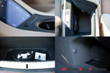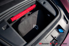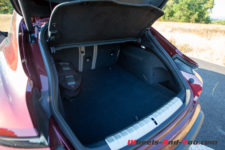 Lorsqu’on monte à l’arrière, on voit très bien le socle de batterie sous les sièges et proche de l’essieu arrière. Le reste des batteries est dans le plancher et il ne fallait pas qu’il devienne trop épais. L’espace dans le coffre est restreint en hauteur, là aussi par les batteries. Le volume du coffre est de 405 litres, 41 litres sont occupés par le caisson de basse Bose optionnel. Il y a un faux-plancher assez étroit au milieu et deux cavités sur le côté, derrière les roues.
