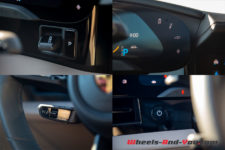 Le tableau de bord est également un écran, où le compteur central ne peut pas afficher de traditionnel compte-tours mais un afficheur de dépense/récupération d’énergie. Chaque cadran est modulable et peut exposer des informations différentes ou tous peuvent être remplacés par la carte. À gauche du volant, point de serrure, juste le bouton qui éteint la voiture, une demi déception pour moi. À droite se place le sélecteur de vitesse, plutôt qu’au centre ou sur la colonne de direction, c’est une individualité.