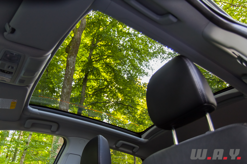 La position de conduite idéale n’est pas aisée à trouver malgré les réglages multiples du siège, mais une fois les ajustements effectués, je dispose d’une situation dominante très confortable. Le volant est enrichi sur sa partie inférieure d’un élément laqué de noir, que je retrouve également sur la console centrale et sur le cadre des commandes de vitres électriques. Cela donne une touche très élégante quoique très brillante. J’ai beaucoup apprécié l’instrumentation. Les commandes sont simples et ergonomiques. L’écran tactile de navigation est imposant et les informations distillées sont très complètes ; il est cependant regrettable que le graphisme semble dater d’un autre temps. Le toit panoramique, qui m’avait déjà séduit sur d’autres modèles du groupe est également disponible en option. De nuit, deux rangées de lumière LED s’illuminent de chaque coté du pavillon de toit lui donnant des airs de sapin de Noël. Fort heureusement cet éclairage d’ambiance peut être modulé et même désactivé.