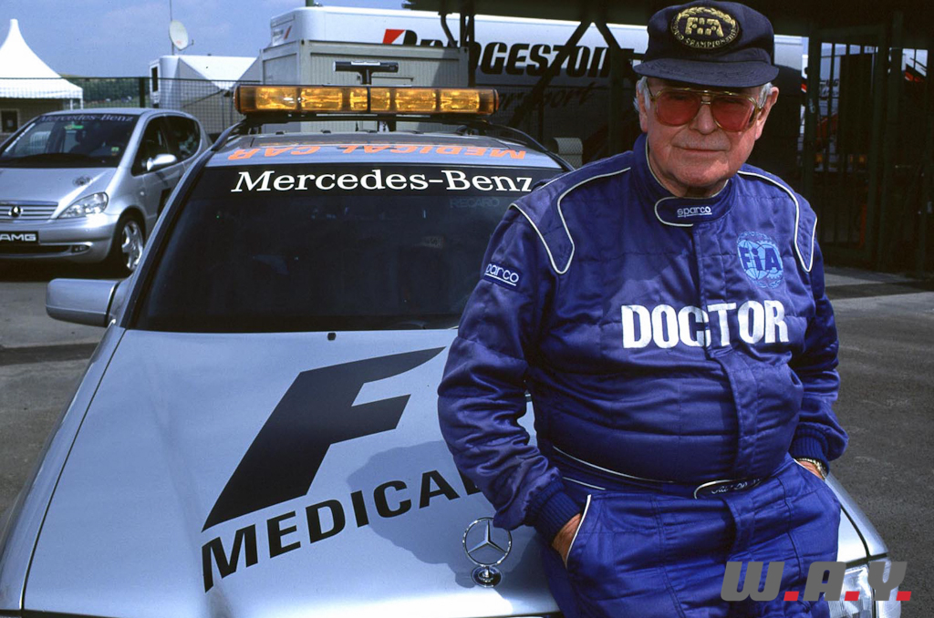 Sid Watkins a été engagé en 1978 par Bernie Ecclestone pour superviser les activités médicales lors des Grands Prix de Formule 1, tout en conservant son poste de neurochirurgien à Londres. L’assistance médicale sur les circuits se résumait à l’époque à une simple tente qui abritait un toubib, quelques soignants et un nécessaire sommaire pour les soins. Après l’accident fatal de Ronnie Peterson lors du premier tour du Grand Prix d’Italie la même année, où le Prof. Watkins dû attendre 18 minutes pour accéder à la victime car la police italienne avait déjà bouclé le périmètre de l’accident en attendant l’arrivée de l’ambulance, il exigea de Bernie Ecclestone la mise à disposition sur chaque Grand Prix d’une voiture médicale, d’un hélicoptère, d’un médecin anesthésiste et d’un matériel de pointe. Ce fut chose faite dès la course suivante aux USA.
