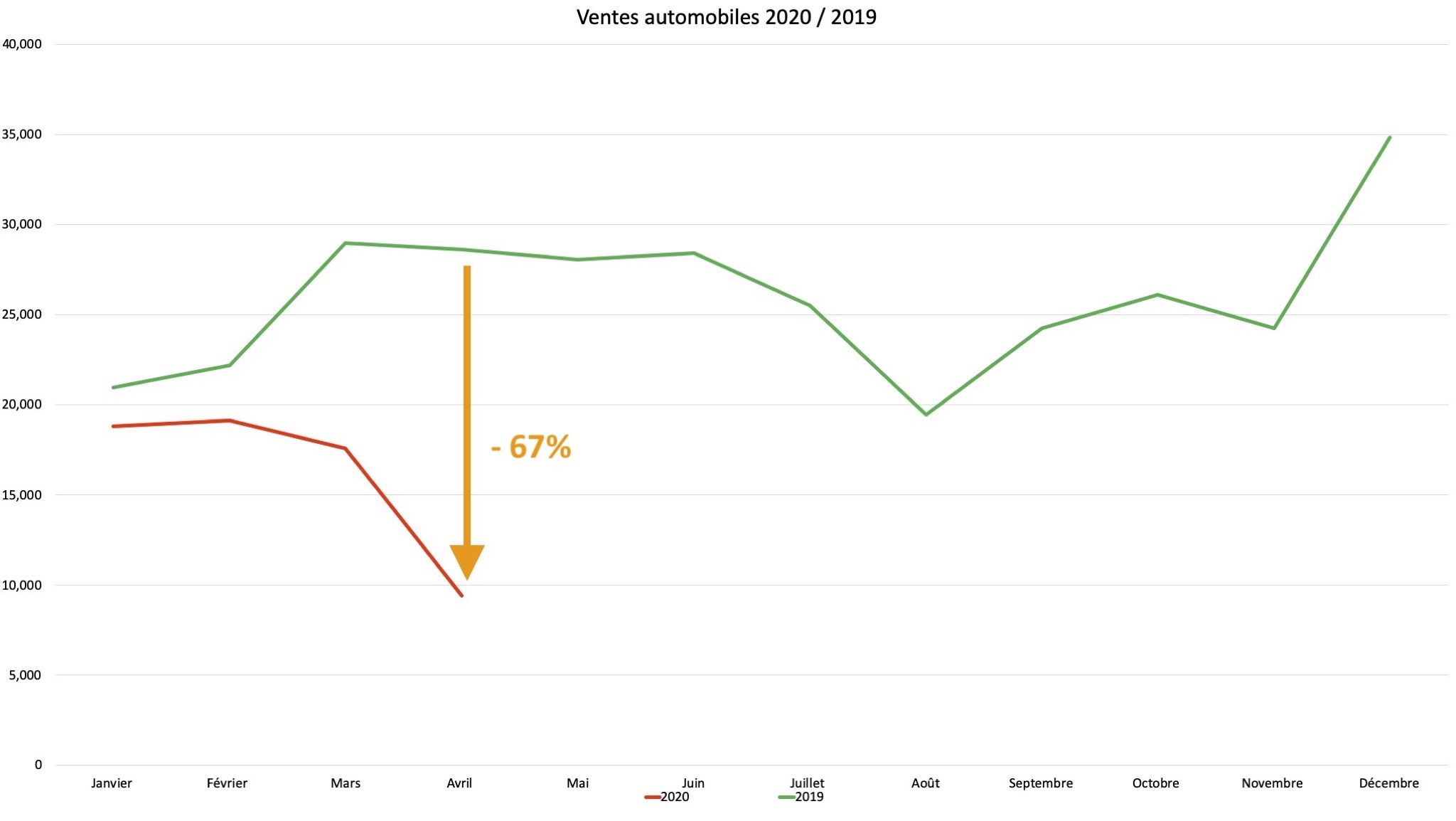 Pour rappel, le CF a déclaré le 16 mars que le pays était en état de “situation extraordinaire” avec, comme conséquence, une économie pratiquement arrêtée à l’exception du personnel essentiel. Chez nos voisins français c’est encore pire avec un mois de mars à -72% et avril à -89%.