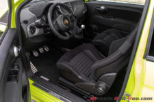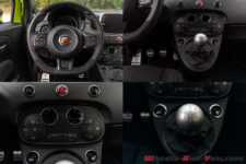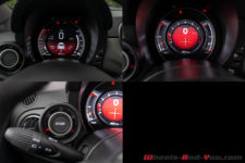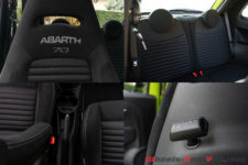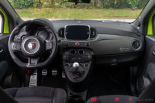 L’habitacle est soigné mais même si la casquette est en alcantara, même si le levier de vitesse et les pédales sont en alu, même si volant et frein à main sont en cuir et alcantara, certains plastiques du tableau de bord et des contre-portes issus de la Fiat 500, font taches et sont indignes du logo Abarth. Je préfèrerais même avoir la tôle peinte ou alors, rêvons un peu, des portes ou contre-portes en carbone… Il existe d’ailleurs une option pour la partie basse du tableau de bord. C’est superbe et donne vraiment un aspect racing.