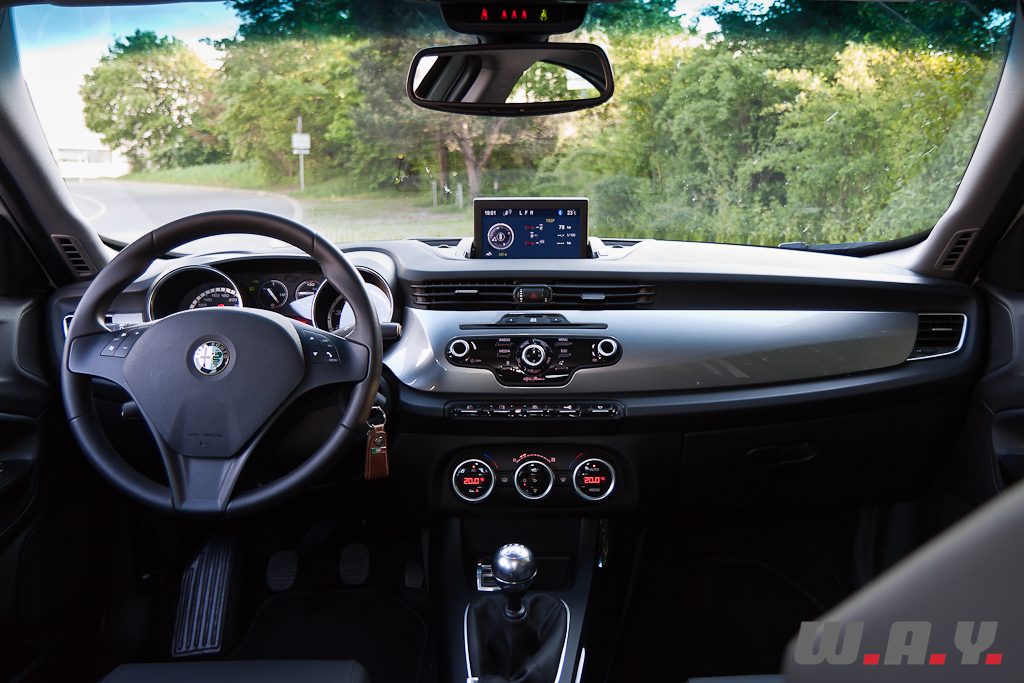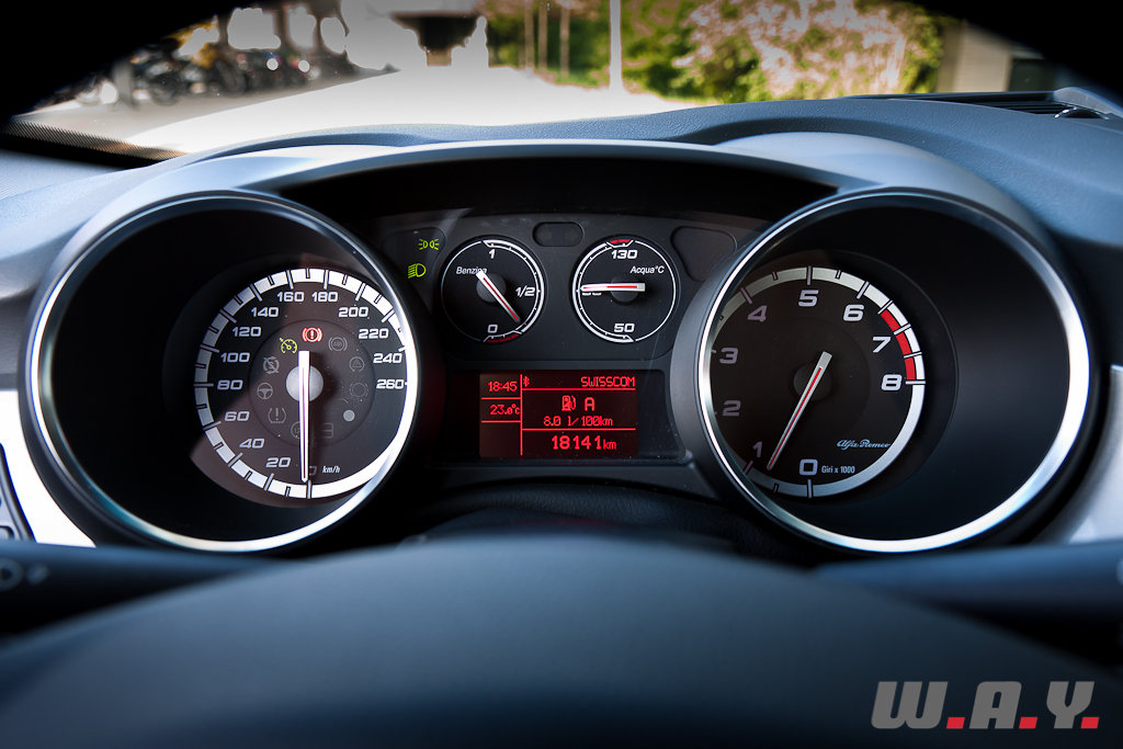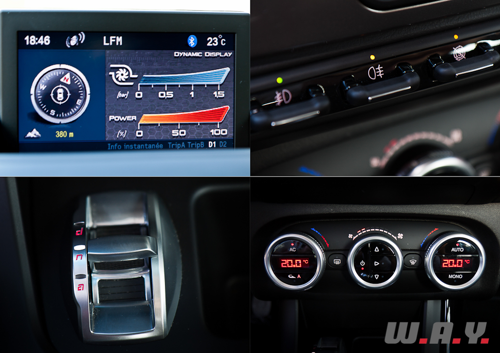 Très élancée et empreinte de nostalgie rappelant les glorieux modèles seventies de la marque avec les compteurs engoncés au fond de leur cylindre, la planche de bord n’est pas pour autant dénuée de modernité. Recouverte sur sa façade d’une coque couleur aluminium (le vrai métal ou le carbone sont également disponibles en option), elle abrite tout ce que l’on est en droit d’attendre d’une auto d’aujourd’hui. L’écran du GPS/ordinateur de bord s’escamote du sommet de la planche tandis que la console, face aux passagers, abrite les commandes de la radio ainsi que les gros boutons de la climatisation. L’ensemble est plutôt bien pensé, ergonomique, et quelques formes rappellent ici aussi le passé comme la série de commutateurs à bascule. La qualité de l’assemblage ainsi que la finition confirment les progrès entamés sur la Mito. De même, la qualité générale des matériaux, moussés et satinés, est plutôt flatteuse. Toutefois certains choix de plastiques frustres et bas de gamme au niveau des contre-portes et hors du champ visuel habituel auraient mérité un peu plus d’attention.