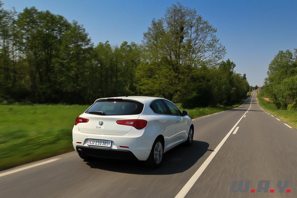 Très dynamique dans son tempérament, la Giulietta s’avère agile et réactive sur la route. La caisse est rigide de part l’utilisation d’aciers à haute résistance et la présence d’aluminium a permis de contenir son poids, donné par le constructeur à 1’365 kg. Le châssis est vif et équilibré. Les enfilades de virages s’enchaînent avec facilité en conservant un comportement toujours rassurant. La prise de roulis est contenue en conduite normale. Il n’y a que lors de très gros appuis ou freinages très appuyés que le train avant aura tendance à prendre du roulis et devenir flou. La monte pneumatique « taille haute » équipant notre voiture d’essai y est probablement pour quelque chose, mais c’est surtout l’amortissement qui est à mon sens peu en phase avec le caractère sportif de notre compacte. « Ni trop dur, ni trop mou », il assure un confort de premier ordre avec efficacité. Mais en conduite dynamique les suspensions nuisent à la précision des trajectoires, impliquant de nombreuses petites corrections du volant. De plus, lors de gros freinages, même si les freins remplissent parfaitement leur tâche, l’auto s’écrase littéralement sur son train avant. Le choix de l’un des « Pack Sport » dotant la Giulietta d’un amortissement typé sport devient alors incontournable.