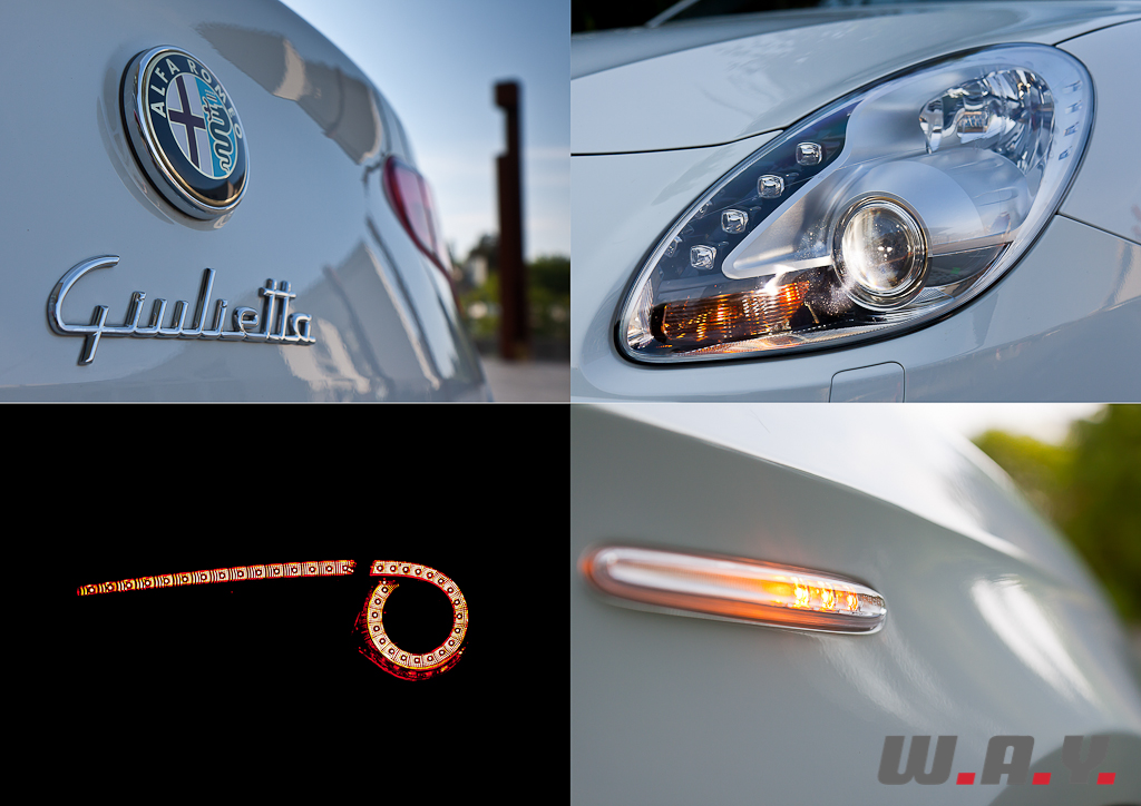 Le moins que l’on puisse dire est que la Giulietta séduit dès le premier coup d’œil. Plus élancée que la 147, elle arbore avec fierté des lignes à la fois élégantes et dynamiques. La face avant garde le lien de parenté avec la Mito tout en jouissant d’une personnalité qui lui est propre. Les blocs optiques allongés mettent ainsi en valeur la désormais classique calandre allongée sur laquelle viennent mourir les nervures du capot. Tout en rondeur dans sa partie haute, l’avant affiche quelques lignes acérées au bas du bouclier. Grâce à l’astuce inaugurée pour la première fois sur la 156, consistant à cacher les poignées des portes arrière dans leur montant, ainsi que les petites surfaces vitrées, notre Juliette se donne de faux airs de coupé. L’arête latérale qui parcourt les flancs ajoute une pointe de dynamisme bienvenue sur ces grandes surfaces de tôle. Je regrette cependant la présence sur notre modèle d’essai de roues 16″ clairement sous-dimensionnées visuellement pour donner un vrai caractère sportif à notre Giulietta. Fort heureusement le catalogue d’options recèle de petits trésors qui vous permettront de personnaliser à votre goût cette Italienne. La poupe apparaît plus consensuelle mais traitée avec soin malgré tout; très haute et massive, elle s’orne de deux magnifiques plis de carrosserie soulignant les guirlandes de LEDs des feux arrière.