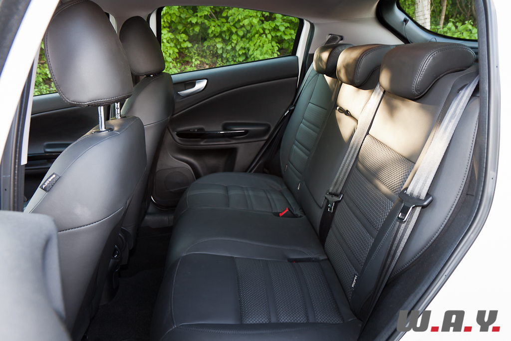 Toisant 13 cm de plus en longueur que la 147, je m’attendais à retrouver ce gain en termes d’habitabilité. C’est le cas à l’avant où la position de conduite idéale est aisément trouvée au moyen des nombreux et amples réglages du siège et de la colonne de direction. Mais le gros point faible reste l’espace à l’arrière ; déjà souligné en son temps sur la 147, ce défaut persiste sur la Giulietta, auquel il faut ajouter une garde au toit et des surfaces vitrées réduites. Les grands gabarits souffriront certainement de claustrophobie.