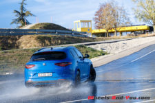 Un passage sur la piste du TCS à Cossonay me permet de découvrir en toute sécurité le tempérament enfin révélé de ce Stelvio Quadrifoglio. Alors que la Giulia demande des notions avancées de pilotage, le grand frère est lui plus facilement domptable. Grâce à la transmission intégrale, la puissance passe parfaitement au sol et le comportement routier n’est pas traître. Attention quand même aux excès de confiance, le poids se fait ressentir rapidement, il faut savoir le manier avec douceur sous peine de vite en perdre le contrôle.