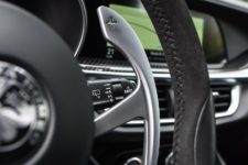 Je passe donc rapidement en mode « Dynamic » et le Stelvio commence enfin à ouvrir son cœur. L’ambiance est plus sportive, toutefois la suspension reste très confortable et le comportement moteur, même sans pour autant changer manuellement les rapports, n’est pas trop extrême. En fait, à mes yeux, c’est ça le mode « par défaut » d’un Stelvio Quadrifoglio. Quand la première entrée d’autoroute est en ligne de mire, j’écrase l’accélérateur et me voilà catapulté sur la file de gauche à la vitesse de l’éclair ! Ah oui, les bien 510 chevaux sont bien présents sous le capot et lorsqu’on les sollicite ils répondent sans hésitation. C’est grandiose ! Bon, va falloir se modérer car on atteint tout aussi rapidement des vitesses non-avouables. Je regrette cependant une direction pas assez incisive à mon goût et je trouve toujours la mécanique un peu trop polie. J’ai connu des italiennes bien plus expressives, notamment la Giulia Quadrifoglio. En fait, comme je le disais au préalable, afin de rendre l’auto utilisable de tous, les ingénieurs ont dû gommer en partie le côté démoniaque qui anime la berline.