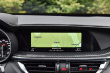 En prime, l’équipement de ce Stelvio Quadrifoglio est ultra complet avec tout ce que l’on peut attendre d’une voiture de ce rang de nos jours. Le système infotainement est réactif et dispose de toutes les dernières technologies. Je lui trouve un défaut quand même. Alors que son écran de 8.8 pouces est largement assez grand, l’affichage de la caméra de recul est lui beaucoup trop petit. On l’avait déjà relevé lors de nos précédents essais Alfa Romeo et, franchement, je ne m’y fais pas.