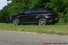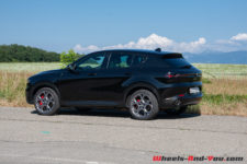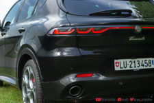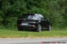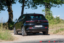 J’aime beaucoup les feux arrière. Ils reprennent les codes lumineux Alfa Romeo et le bandeau qui les relie. Deux grosses sorties d’échappement montrent que ce SUV peut en découdre s’il le faut. Même si c’est un SUV, ce Tonale, perché sur de magnifiques jantes 19 pouces montrant de beaux étriers Brembo rouges, reste esthétiquement parlant une Alfa.
