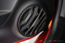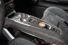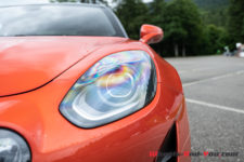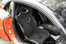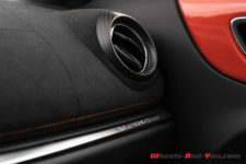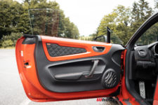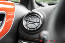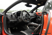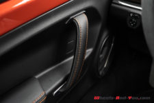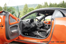 Peu de différence également au moment de s’installer à bord vis-à-vis de la première génération. Notons quand même que la S dispose en série des sièges baquets Sabelt. De plus, sur notre voiture d’essai, ce sont des versions Racing, entièrement en microfibre, et qui plus est agrémentés de surpiqûres orange. C’est vraiment du plus bel effet. Tout cela vient de pair avec le Pack microfibre qui se compose notamment du ciel de toit et du tableau de bord en microfibre, ainsi que du volant qui dispose lui aussi des surpiqûres oranges. L’ensemble est magnifique.
