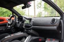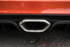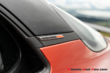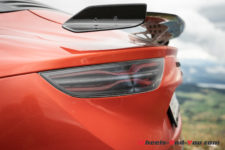 Notre A110 S arbore une teinte « Orange Feu » qui lui sied à merveille, surtout combinée à différents éléments en carbone et aux jantes 18 pouces GT Race Noir diamantées. Pour revenir au carbone, il habille tout d’abord le toit, offrant un contraste saisissant avec la carrosserie, mais aussi le Kit Aéro, disponible en option, à savoir une lame avant et un aileron arrière. Rarement fan de ce genre d’attribut, j’avoue que ça lui va très bien, d’autant plus avec cette robe relativement provocatrice. Attention quand même, la lame est un élément sensible, le transporteur qui nous a livré la voiture en a fait les frais d’ailleurs.