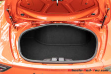 Jusque-là, tout va bien pour une utilisation quotidienne, mais ça se gâte lorsqu’on aborde les sujets des rangements. Tout d’abord il n’y a pas de boite à gant digne de ce nom. Certes, on peut agrémenter l’habitacle d’un pack de rangement, mais ça reste un peu folklorique. De plus, les coffres, un à l’avant et un à l’arrière, offrent respectivement seulement 96 et 100 litres. On oublie directement l’idée d’y placer un sac de golf, mais même pour un simple bagage cabine c’est compliqué, ça ne passera qu’à l’avant car derrière l’ouverture est vraiment petite. Et je ne parle pas des sacs de courses qui se placeront dans l’idéal sur le siège passager pour éviter de broyer vos achats. Encore une fois, je suis critique sur ces détails car je visualise cette A110 comme une voiture de tous les jours. Si l’objectif est d’avoir une voiture plaisir, pas de souci, il faudra juste partir en vacances avec des sacs souples et ça ira parfaitement bien.