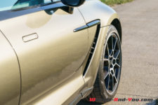 Mon véhicule de presse est équipé de magnifiques jantes de 22’’ chaussant de généreux 285/40 ZR 22 à l’avant et 325/35 ZR 22 à l’arrière, qui laissent découvrir d’énormes étriers de frein jaunes. Autant dire que ça annonce directement la couleur quant aux performances promises ! Et, malgré tout, sa livrée Arden Green, une couleur plutôt discrète associée au pack extérieur Noir Brillant qui élimine tout élément chromé, lui sied parfaitement. J’aime particulièrement les variations de teinte qu’elle prend selon l’incidence de la lumière.