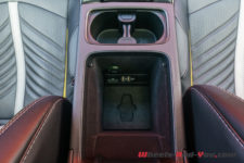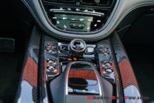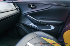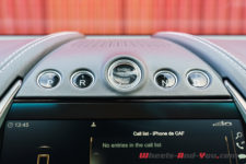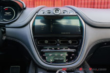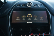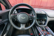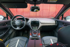 Le DBX707 présente également quelques évolutions intérieures, notamment une nouvelle présentation du bas de la console centrale qui voit l’apparition d’un deuxième sélecteur rotatif. Il facilite la sélection des modes de conduite et permet de passer la transmission en commande manuelle via une simple pression. Les palettes de sélection des rapports demeurent fixes sur la colonne de direction pour mon plus grand plaisir. Bien entendu, la signature Aston Martin que représentent les cinq boutons situés en haut de la console centrale – quatre qui remplacent le levier de sélection de la transmission automatique et un au centre pour démarrer le moteur – demeurent en bonne place.