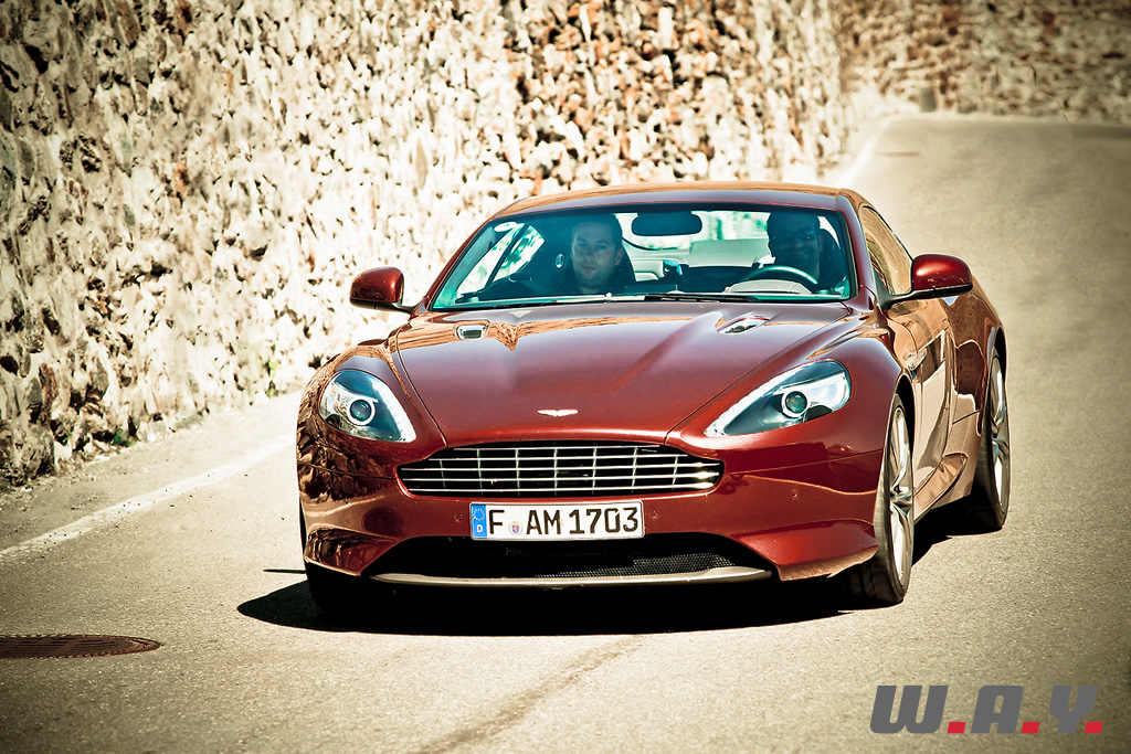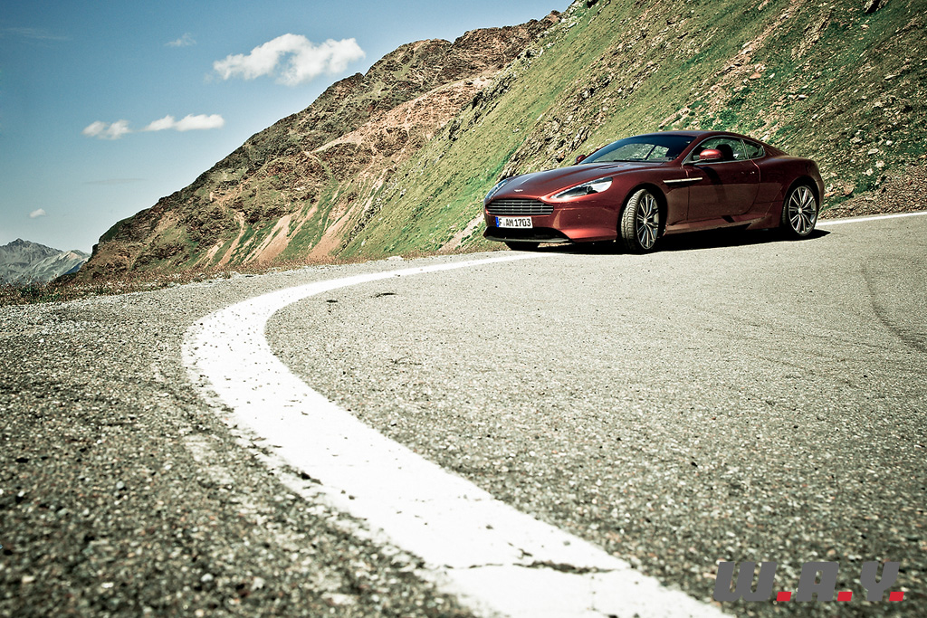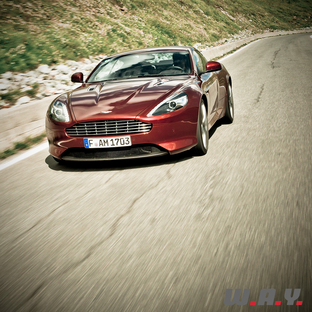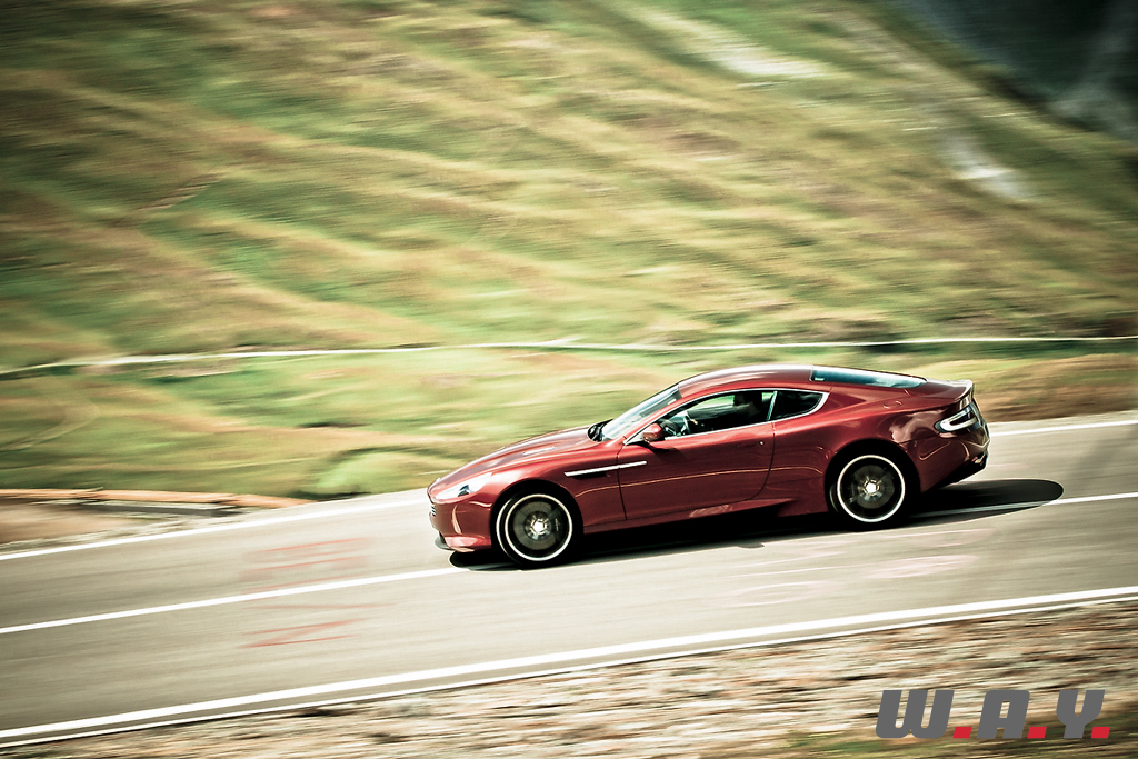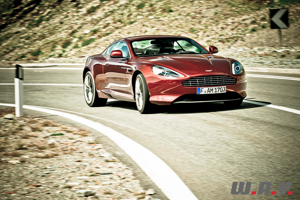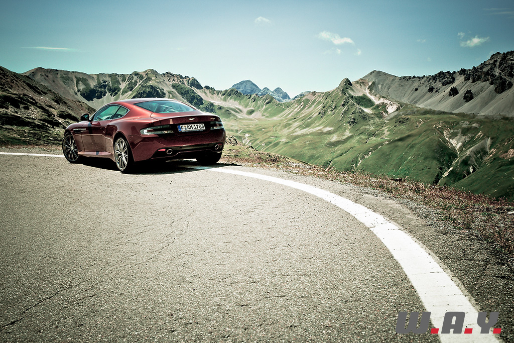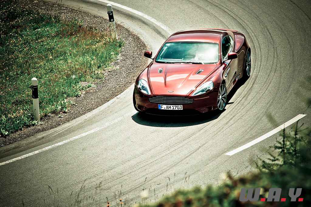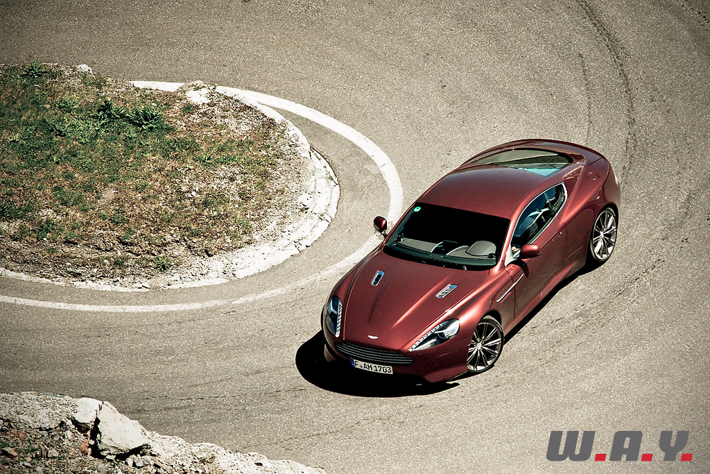 C’est avec une impatience non dissimulée que je prends le volant de l’élégante. En quittant St-Gall, la boîte en mode automatique est douce, sans à-coup. Sur l’autoroute rhénane, à 120 km/h, le V12 ronronne doucement à 1’950 t/min. Les premiers lacets du col du Julier sont l’occasion d’apprivoiser la belle, qui se conduit avec une facilité étonnante malgré son gabarit. Et tout de suite, elle démontre son appellation avec assurance : elle entre dans les virages sans sourciller et ceci même lorsqu’on augmente le rythme. Ce sera la surprise positive de cet essai : un train avant à l’efficacité redoutable ! Pas une seule fois je n’aurai ressenti une amorce de sous-virage, même en abordant les épingles les plus serrées en force et malgré le différentiel à glissement limité. Associé à un roulis limité bien géré par l’amortissement piloté ADS, la Virage invite à dévorer les virages et se faire plaisir. Corolaire de ce train avant très directeur, la remise des gaz rend le train arrière joueur, qui enroule volontiers dans les virages moyens ou serrés tout en conservant une bonne motricité. Il en résulte un sentiment d’agilité assez étonnant pour une voiture de ce gabarit et, en déconnectant les assistances électroniques à la conduite, la belle décrit volontiers de belles dérives malgré sa monte de 295/35 ZR 20 à l’arrière. Dans les grandes courbes par contre, la stabilité est parfaite, même sur route très bosselée et à rythme élevé. Le tout est étonnamment sécurisant.