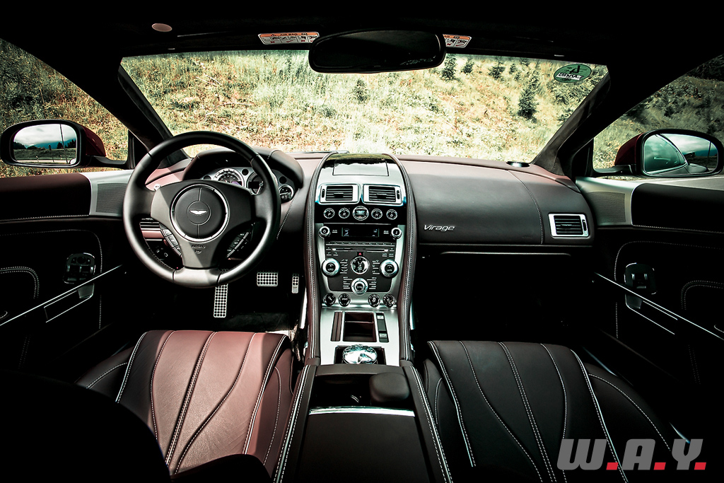 Longue de 4.7 mètres, les lignes de l’auto reprennent en grande partie celles de feu la splendide DB9. Longues, douces, effilées et félines, avec une calandre reconnaissable entre toutes, certains trouveront les porte-à-faux avant et arrière un peu grands ; on est loin de la silhouette plus ramassée d’une V8 Vantage. L’équilibre des volumes est celui des « grandes » Aston Martin puisque la Virage en reprend la sempiternelle plateforme VH en aluminium extrudé collé et riveté, mais la ligne est plus râblée, mieux campée sur des grosses roues de 20 pouces. La carrosserie allie l’aluminium, l’alliage de magnésium et les composites pour ne peser « que » 1’785 kg. Pas mal pour une voiture de ce gabarit. Et qu’elle élégance dans cette ligne sans pareille !