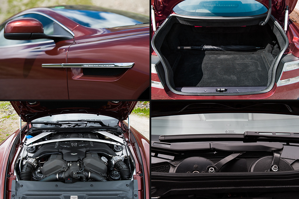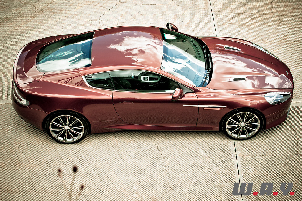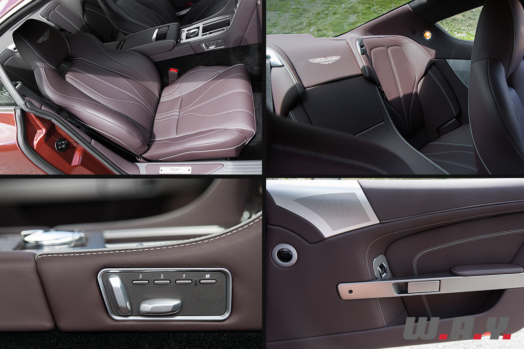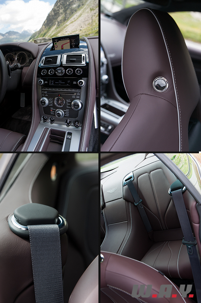 Notre voiture d’essai s’ornait de la teinte Bridgewater Bronze; un peu sceptique à son annonce, force est d’admettre que cette livrée habille parfaitement notre diva sans être toutefois trop ostentatoire. L’esthétique n’évolue que discrètement en regard d’une ancienne DB9. Un bouclier avant modernisé, avec des ouvertures élargies et une lame avant à l’allure sportive, son homologue arrière intégrant un diffuseur plus esthétique que fonctionnel, entouré de part et d’autre des deux grosses sorties d’échappement et deux grilles d’aération redessinées sur le capot. C’est à peu près tout. Les optiques bi-xénon plus effilées intègrent désormais des feux de position et des clignotants à LEDs. C’est aussi cette nouvelle technologie d’éclairage qui équipe les feux arrière. On retrouve les ouïes latérales barrées d’une baguette chromée intégrant le rappel de clignotant, constante de la marque. Les essuie-glaces sont bien protégés par l’immense capot avant qui vient mourir à fleur du pare-brise, le balai de droite adoptant une cinématique spécifique pour augmenter la surface couverte. Quant aux portières, elles ne comportent pas de montant et s’articule toujours en “aile de cygne”, une autre tradition Aston.