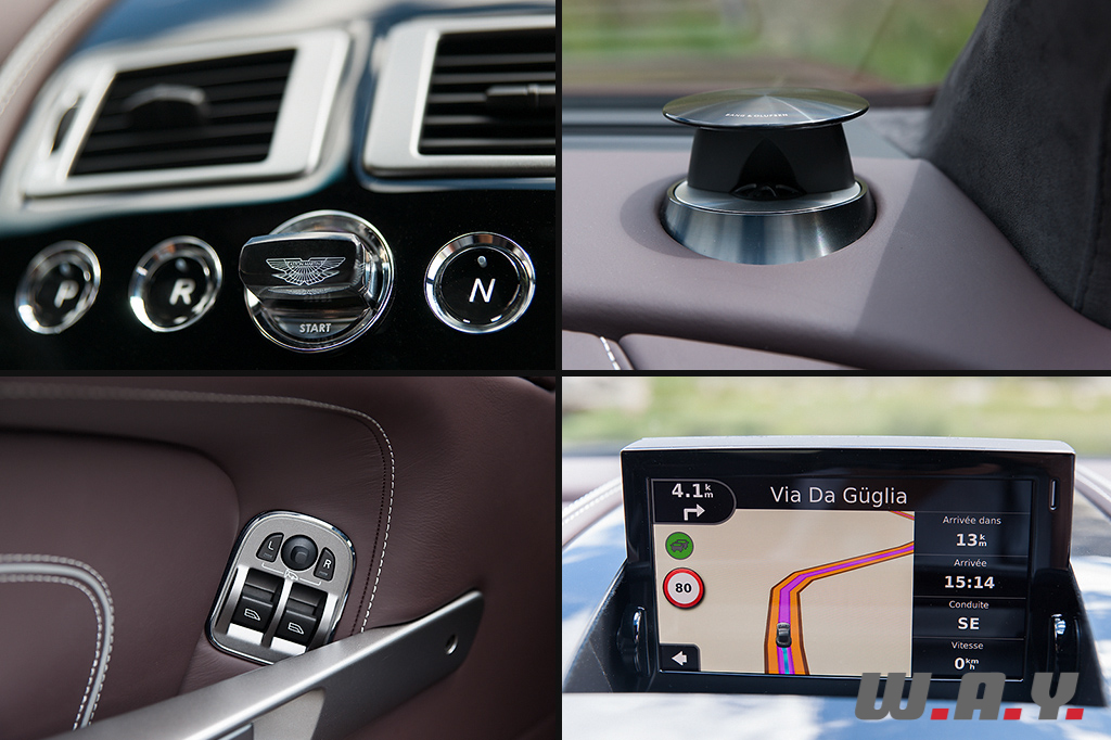 Le volant dont le cuir ne reprend pas la teinte de l’habitacle présente un design sportif. La console centrale inclut un porte-carte fort pratique et, pour les fumeurs, un cendrier en aluminium taillé dans la masse du plus bel effet. Pour ma part, un seul détail me déroute quelque peu chaque fois que je monte dans une Aston Martin : le compte-tours qui tourne à gauche et non à droite ; un peu illogique alors que le moteur tourne bien à droite… Autre point sur lequel les Aston Martin font l’impasse pour le moment : le réglage de climatisation n’est pas séparé entre conducteur et passager. Le GPS proposé a évolué depuis nos précédents essais. L’écran repliable, situé en haut de la console, est désormais de meilleure qualité et la commande nettement plus intuitive, intégrant une interface conçue par Garmin.
