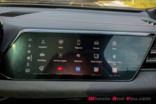 Je trouve le pare-brise assez bas, avec le grand rétroviseur intérieur qui masque une bonne partie de la vision vers l’avant droit. Le large écran du tableau de bord est très lisible et facile à utiliser grâce au pavé d’icônes configurable et visible en permanence. Lorsqu’on utilise Apple CarPlay ou Android Auto, on peut accéder directement à d’autres fonctions comme la navigation ou la radio de bord. Les réglages de la climatisation sont aussi tout le temps affichés dans la partie inférieure de cet écran. L’affichage tête haute offre également la possibilité de choisir les éléments affichés.