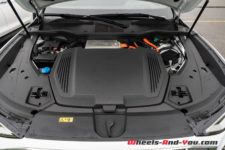 Si l’extérieur ne surprend pas, l’intérieur est du même acabit. Lorsque je m’installe à bord, difficile de voir qu’il s’agit d’un véhicule électrique avant de presser sur le bouton Start. Il y a même des palettes au volant ! Les seules différences perceptibles sont un affichage compteurs spécifique avec, à la place du compte-tour, une jauge de couple des moteurs électriques et un indicateur de recharge en décélération. La jauge de charge batterie est identique à celle d’un réservoir de carburant. Tout le reste est directement repris de ses frères thermiques ; j’en veux pour preuve un GPS qui indique les stations d’essence à proximité, un comble pour un véhicule électrique ! Notons que lors d’un calcul de trajet, si l’autonomie restante ne permet pas d’atteindre la destination, le planificateur propose le trajet approprié en fonction des stations de recharge disponibles.