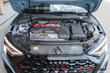 Cette Audi RS 3 conserve encore et, c’est fort heureux, le fameux cinq cylindres turbo 2,5 TFSI de 400 ch. Le couple, disponible un peu plus bas, gagne 20 Nm passe à 500 Nm et les performances sont en hausse. Monté transversalement et associé à une transmission intégrale Quattro, il est « géré » par une boite boîte 7 Stronic avec des rapports légèrement raccourcis. Le 0 à 100km/h gagne trois dixièmes avec un superbe 3,8 secondes. Notre RS 3 est limitée à 250 km/h mais si vous choisissez l’option Pack RS Dynamique, elle pourra grimper jusqu’à 290 km/h.