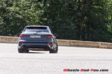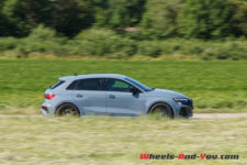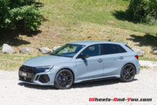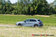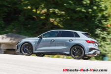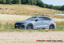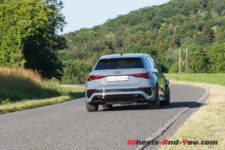 Quoiqu’il en soit, les ingénieurs ont vraiment bien travaillé pour faire évoluer cette RS 3 qui était déjà très aboutie. Elle est démoniaque et permet de rouler vite, propre et en toute sécurité. Ils ont même osé une géométrie sur le train avant avec un petit carrossage négatif de 1°. La suspension est abaissée par rapport à une simple A3 de 25 mm. Avec le pack RS Dynamique et des freins céramiques d’une efficacité exceptionnelle sur route, sans compter le gain de 10 kg de masses non suspendues, cela facilite le travail des amortisseurs et rendant le train avant encore plus précis sur les irrégularités.