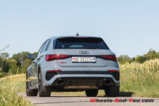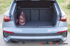 A l’arrière les feux LEDS reçoivent aussi un allumage à séquence dédié RS 3. Le diffuseur arrière est en revanche plus discret avec deux grosses fausses sorties d’échappement ovales bien intégrées. La RS 3 existe en Sportback comme notre voiture d’essai mais aussi en Berline. Cette dernière est un peu plus longue (4,54 m contre 4,38 m) et à peine plus lourde (1’575 kg contre 1’570 kg). J’ai croisé une RS 3 Berline en Vert Kyalami et j’avoue qu’entre les deux cette dernière aurait ma préférence.