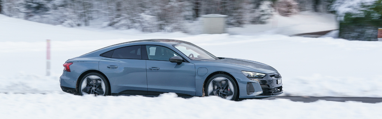 Dès les premiers kilomètres, les quatre roues directrices procurent une jolie dynamique en entrée de virage et un rayon de braquage plutôt court : à peine plus de 11 mètres. Sur la neige par contre, l’auto peine à s’inscrire à la décélération. Heureusement, la remise de couple qui s’effectue de manière prépondérante sur l’essieu arrière inverse la tendance. La motricité est excellente et même sur les plus de 12% de pente du col du Marchairuz par un jour de grosse neige, notre RS e-tron GT prend rapidement de la vitesse.
