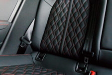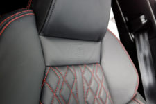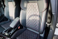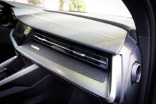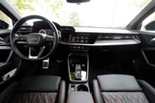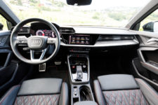 Là aussi, c’est un univers beaucoup plus connoté et résolument plus sportif qui s’offre aux futurs propriétaires de cette S3, à commencer par les sièges. Sans être des baquets de compétition, ils offrent un style personnalisé avec de splendides surpiqures rouges sur un cuir noir et ça ressort à merveille avec le rappel en losange pour la partie dorsale et l’assise. Bien entendu, la marque propose d’autres coloris, mais ce rouge se retrouve comme un fil conducteur sur les portières, le volant, les tapis de sol et le tableau de bord. Cette couleur vive avec une distribution à la fois discrète et présente sur des éléments spécifiques donne une excellente dynamique à l’ensemble.