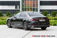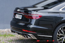 A l’exception des badges S8, le moyen le plus simple de différencier la S8 d’une A8, c’est la quadruple sortie d’échappement. Sans cela, seuls quelques détails ici et là, comme les pinces de frein spécifiques, sont différents et seul un œil très avisé les remarque. Notre S8 se la joue donc discrète.