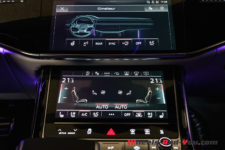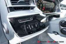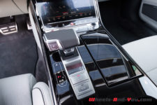 Très confortablement installé dans les sièges aux multiples réglages, chauffants, climatisés et disposant de fonctions de massage, je prends mes marques à bord de cette S8. La présentation est similaire aux autres modèles de la marque mais quelques détails font la différence. Par exemple, les bouches d’aération qui disparaissent une fois le contact coupé, à l’instar des petits haut-parleurs de la sono Bang & Olufsen proposée en option. C’est feutré et de belle facture, difficile de reprocher quoi que ce soit si ce n’est le manque de charme.