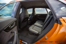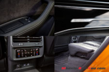 Je choisis d’essayer les places arrière, profitant d’avoir un chauffeur volontaire. Le confort n’usurpe pas la réputation des Audi portant le chiffre 8. J’ai le contrôle de la climatisation et un siège chauffant, ainsi que deux boutons pour la vitre gauche et droite. Tirer encore une fois quand la vitre est fermée remontera électriquement un store pare-soleil. La place laissée aux jambes est généreuse et permet de se mettre à l’aise même lorsque le conducteur recule son siège au maximum. Trois personnes peuvent théoriquement prendre place, mais se retrouver au centre voudra dire voyager épaule contre épaule, ce qui n’est pas optimal.