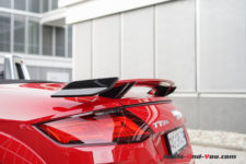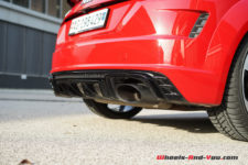 Avant même d’arriver à l’arrière, difficile de ne pas remarquer le spoiler de coffre agrémenté de winglets latérales. Que dire à son sujet, je ne sais pas trop. Dans un sens je le trouve « too much » et d’un autre, je me dis que sans cela, la poupe serait presque banale pour une déclinaison RS. A vous de voir, comme on le sait, les goûts et les couleurs, c’est personnel ! Pour le reste, c’est vraiment dans l’esprit de la TT et ça n’a pas beaucoup changé avec le temps. Je note les phares à la signature lumineuse moderne et le diffuseur qui englobe les deux grosses sorties d’échappement. Petit bémol pour les ouïes factices dans le pare-chocs, franchement ce n’est pas digne de la gamme Audi Sport. Ça n’aurait pas coûté grand-chose de faire des vraies ouvertures avec un grillage alvéolé comme à l’avant.